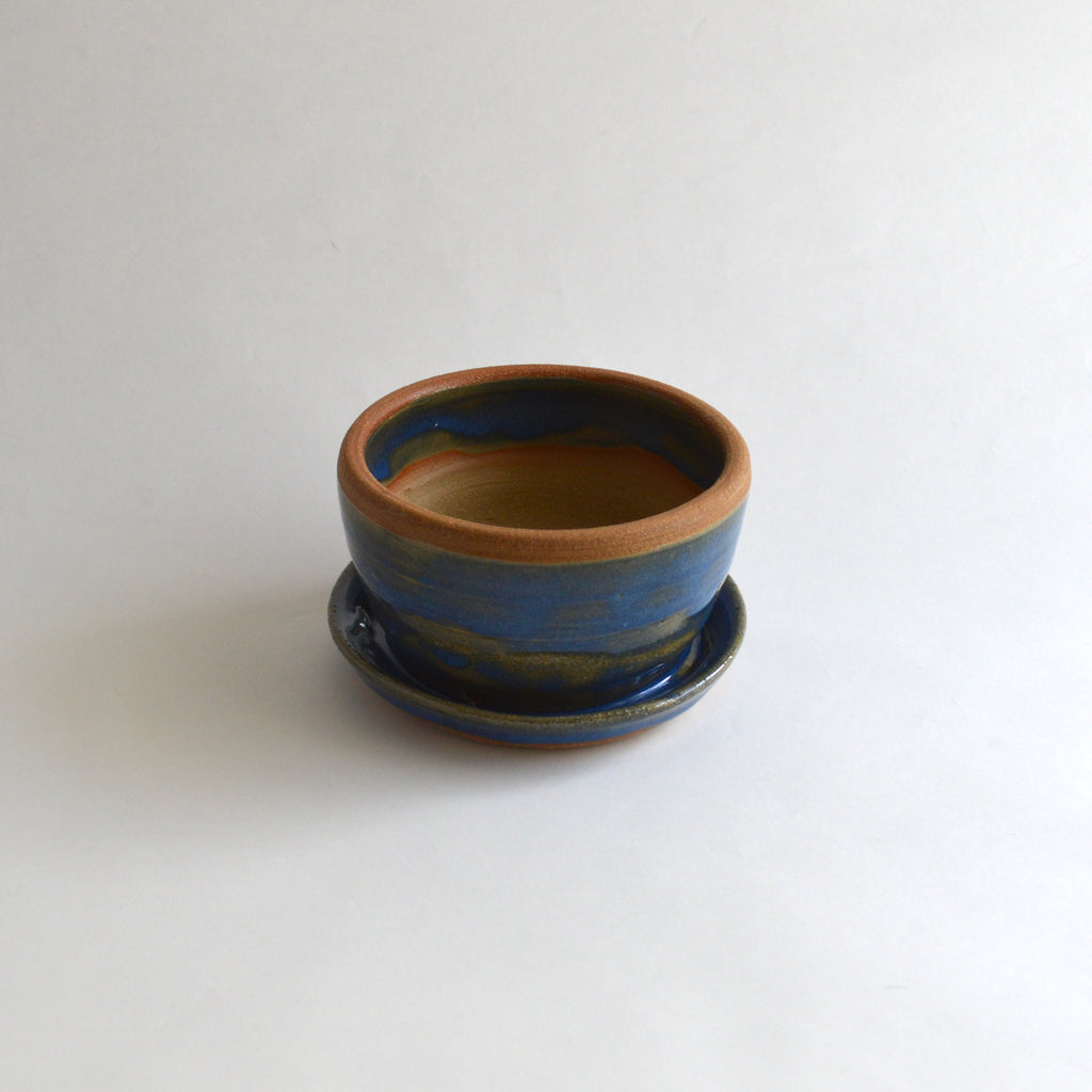 Small ceramic planter with mottled blue glaze and attached dish. Perfect for a cactus or other small houseplant!