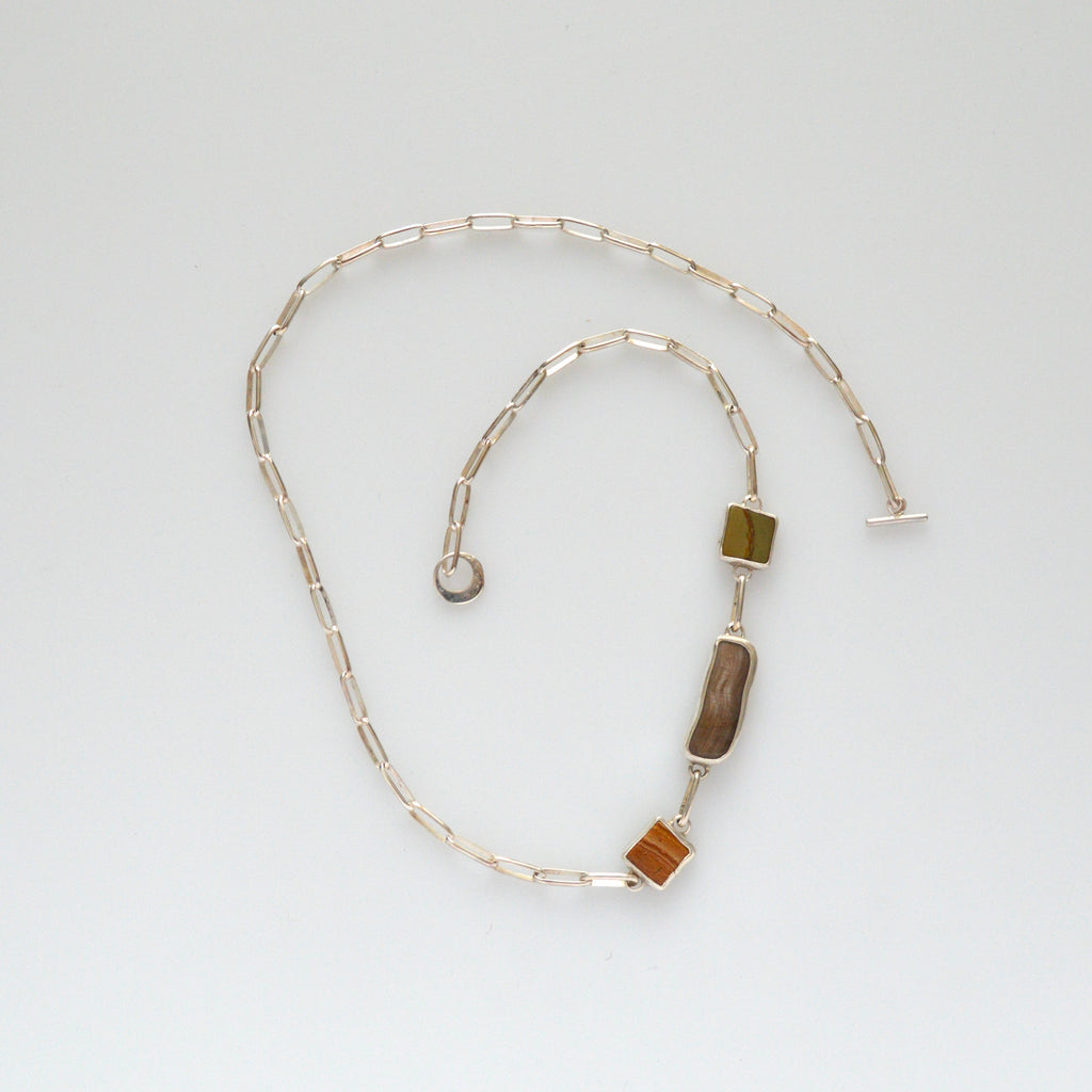 Oregon Owyhee jasper, Gary Green jasper, and petrified wood set in sterling asymmetrically on a chunky handmade sterling silver chain and a sterling crescent moon bar ring clasp.