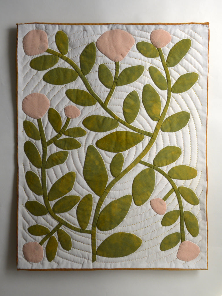 This whole cloth wall quilt features botanically dyed appliquéd flowers and hand quilted with botanically dyed cotton embroidery thread.