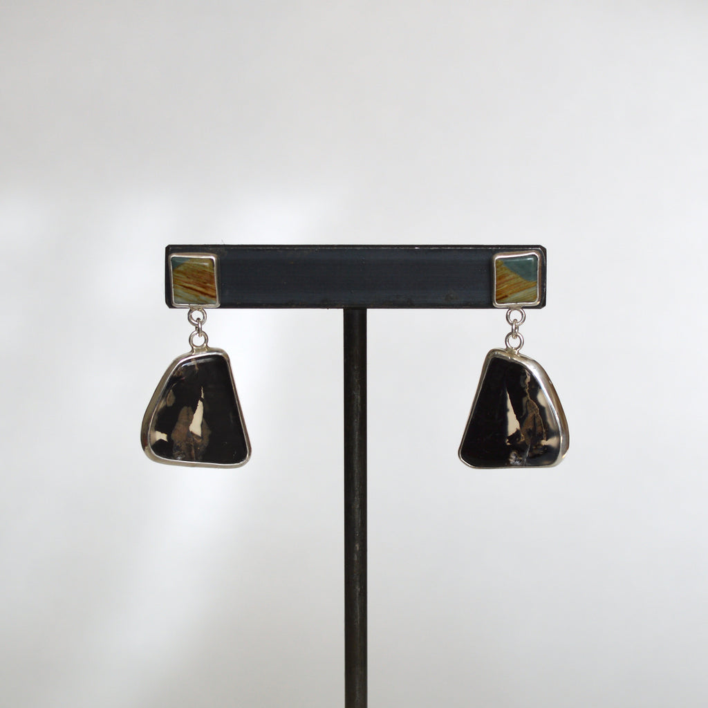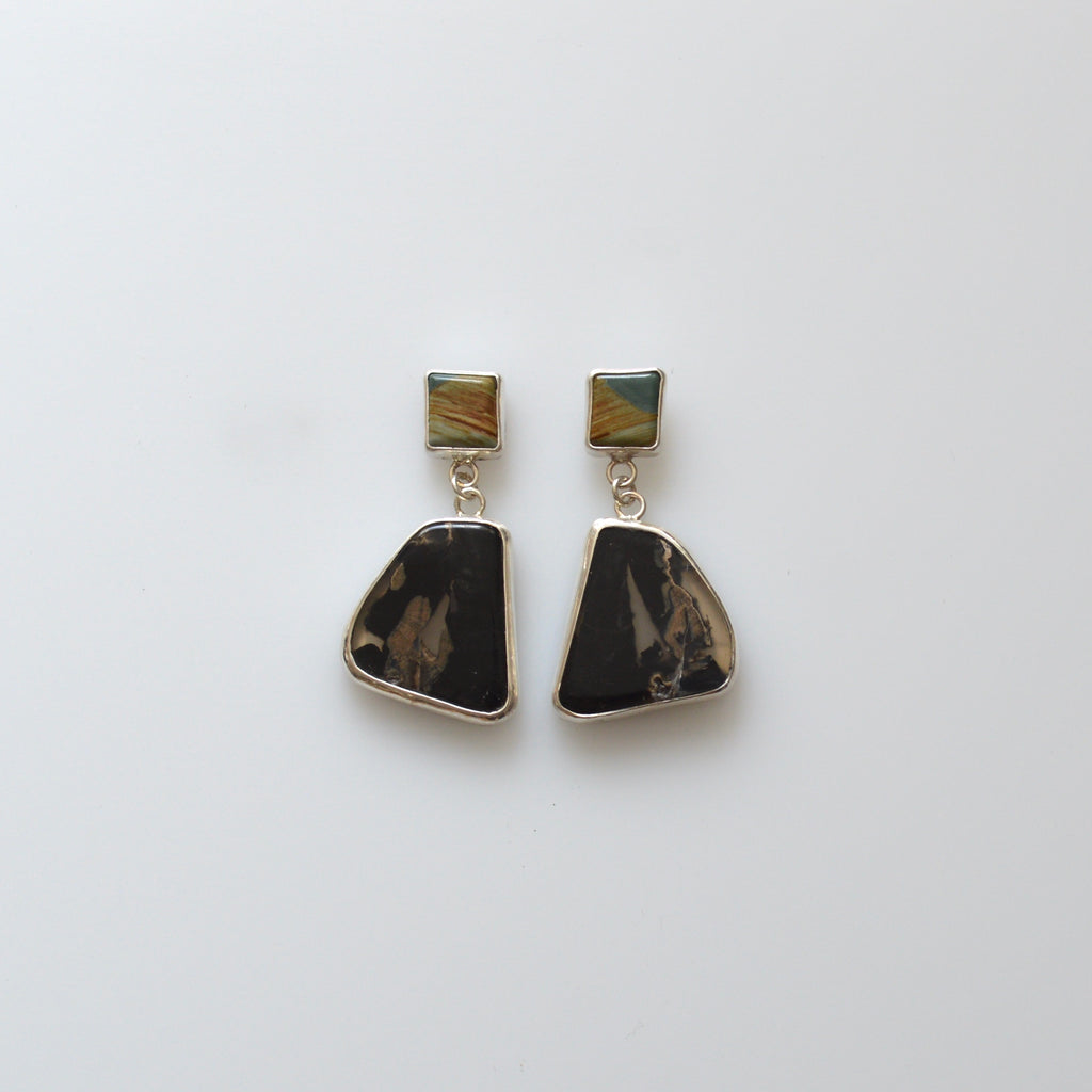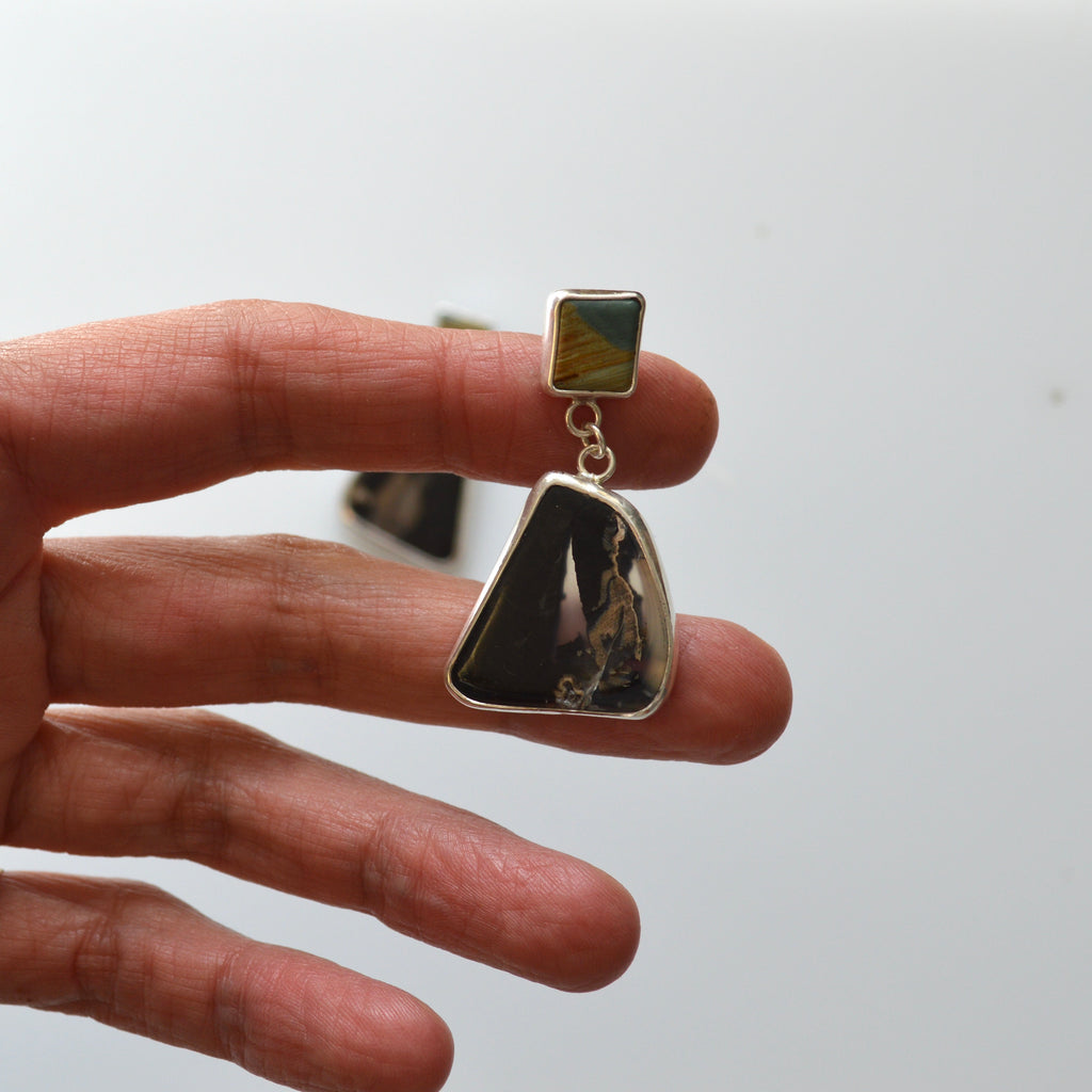 Oregon Gary Green jasper and Wyoming Blue Forest petrified wood chain linked in middle for movement, set in sterling silver with posts and backs. Petrified wood is window set to allow light through translucent sections.